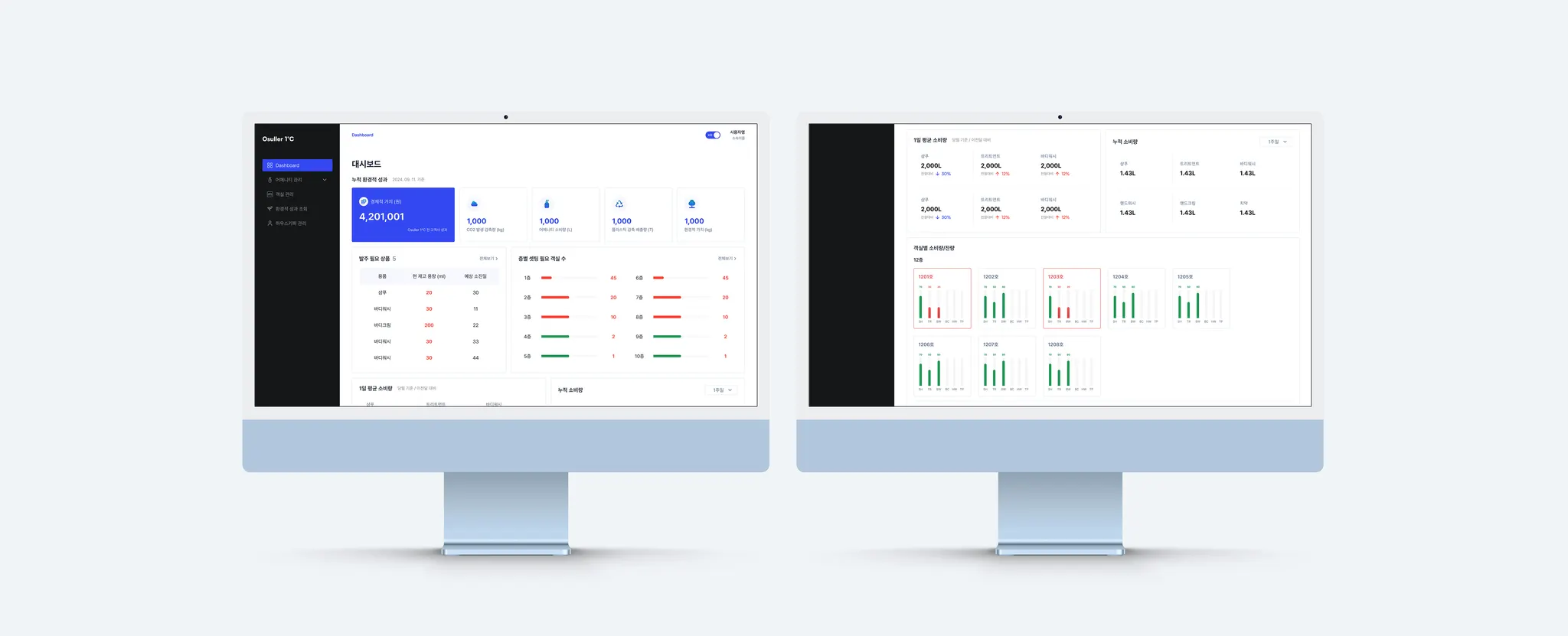 대시보드에서는 누적 환경적 성과 4가지, 재고 상태, 층별 셋팅 필요 객실 수, 평균/누적 소비량, 객실별 소비량/잔량 등의 정보를 한 눈에 제공합니다.