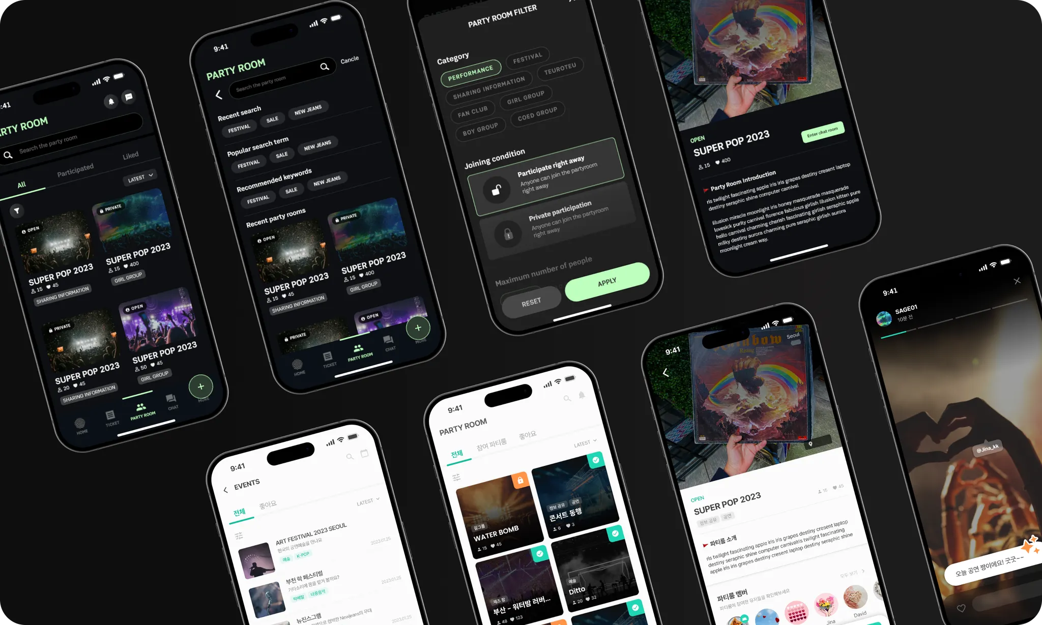 사용자가 필터를 설정하여 파티룸을 직접 검색하고, 조건에 맞는 동행인을 모집하여 함께 라이브 이벤트에 참여할 수 있습니다