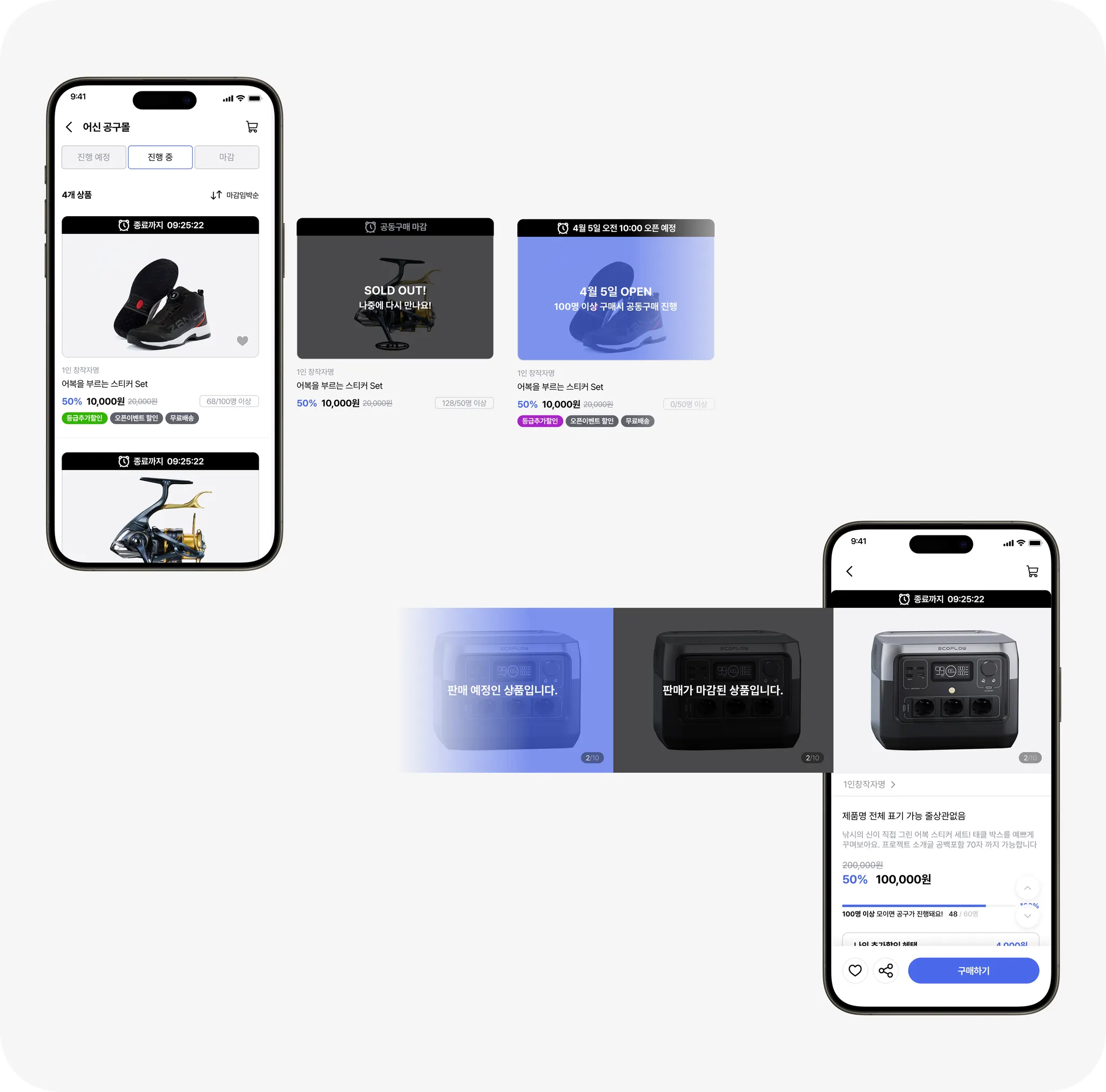 공구몰 페이지에서는 진행 예정/중/마감된 공구 상품들을 확인하고 구매할 수 있습니다